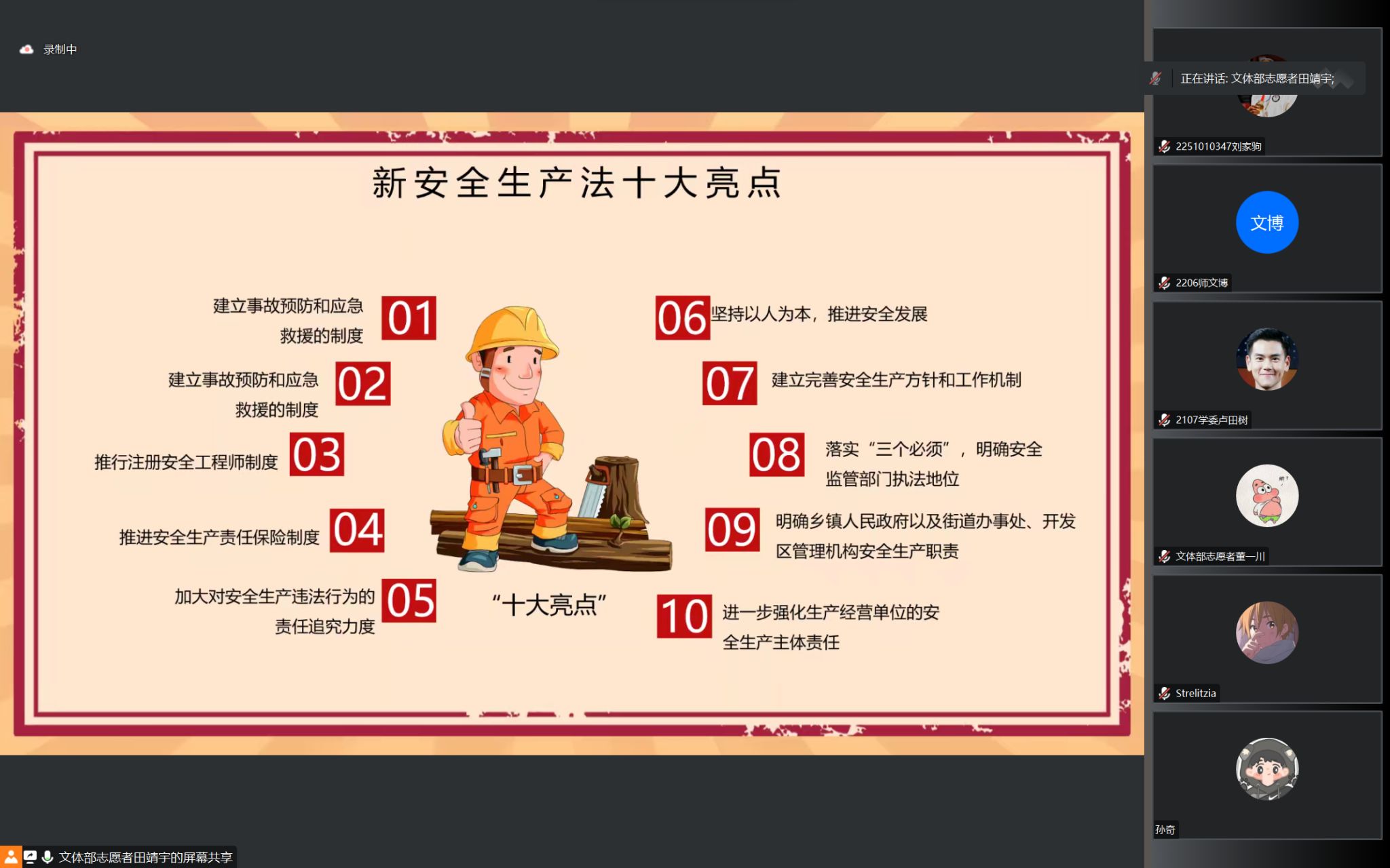 为深入宣传贯彻落实习近平总书记关于安全生产的重要论述精神,全面普及安全知识,提高公司学子的防范意识与应急能力,数计院于6月20日在线上举办了“人人讲安全,个个会应急”宣讲会。