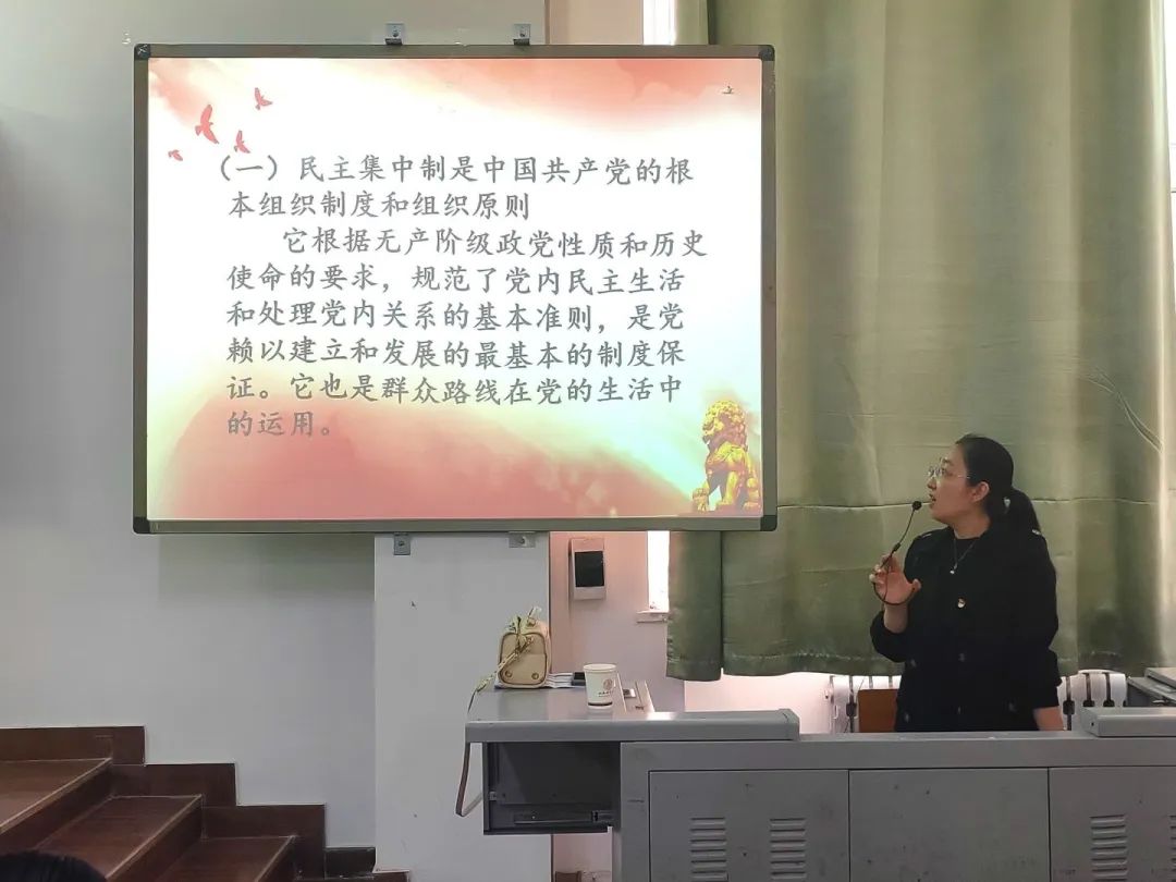 员工第二党支部书记朱燕芬讲述了中国共产党百年奋斗的光辉历程和历史经验,她鼓励学员们深刻理解和掌握这些经验,并以实际行动将其转化为推动自身发展的重要力量。员工第一党支部书记贾静围绕中国共产党的组织原则——民主集中制进行深入介绍,她重点讲解了党内严明纪律,包括政治、组织、工作和保密纪律等方面的内容,并强调严明纪律是党的生命线,是维护党的团结统一和高效决策的根本保证。第二党支部组织委员李萌茹以习近平文化思想为题向大家介绍了“四个自信”,同时与学员们分享了习近平文化思想的相关内容,引导同学们加强爱国主义思想,为实现中华民族伟大复兴贡献自己的一份力量。