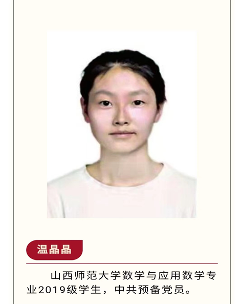 “保持热爱,奔赴下一场山海”是温晶晶对自己经历及成绩的概括。在革命英雄事迹熏陶下,她从小便产生了对中国共产党的信仰与追求,思想进步积极,于2021年6月加入中国共产党。在工作方面,她担任公司团委素拓部负责人,积极组织同学们学习党的先进思想,踊跃参加志愿活动、“三下乡”社会实践活动。2021年2月,在家乡原平市参加疫情防控工作,被评为评为“优秀志愿者”。在学习方面,她刻苦努力,连续两个学年班级综测第一名,获得“国家励志奖学金”。2021年获得第十三届全国老员工数学竞赛山西赛区二等奖。2020年7月在“互联网+”创新创业大赛中作品“5G进入农家校园”获校级三等奖。她因为表现优异,荣获“校级优秀员工”、“校级优秀团员”、“抗疫优秀志愿者”荣誉称号。