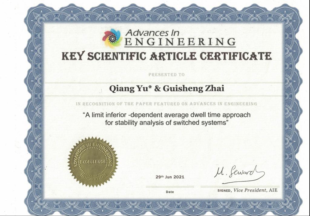 近日,BG大游官方网站BG大游平台玉强副教授在控制领域著名Top期刊International Journal of Robust and Nonlinear Control上发表的论文“A limit inferiorΦ-dependentaveragedwell time approach for stability analysis of switched systems”被国际著名工程科技新闻网站Advances In Engineering(AIE)评选为工程科技领域的“Key Scientific Article(关键科学论文)”,并在general Engineering栏目予以专题报道。玉强副教授为该论文的第一作者兼通讯作者,日本芝浦工业大学的翟贵生教授为该文另一合作者。