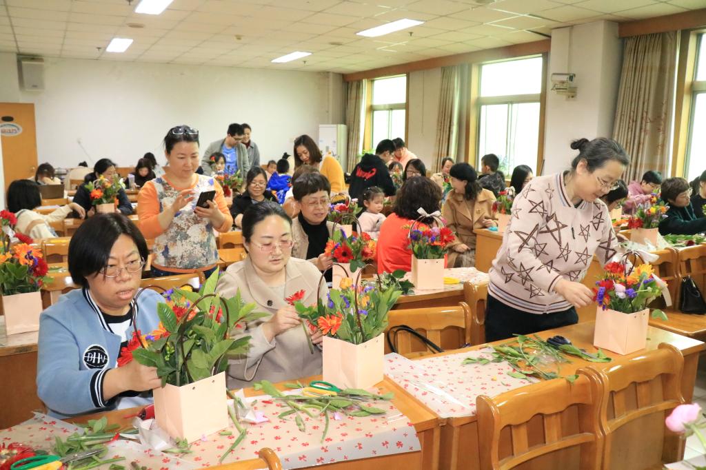 活动伊始,花艺师为女教师们讲解了花艺的分类和插花的原则。插花艺术和绘画、建筑、雕塑等等是相通的,插花中要注意黄金分割比例、色彩、主次关系、平衡等。随后,插花创作拉开帷幕。老师们用鲜花精心设计创作,巧手翻飞系蝴蝶结、剪枝、插花,现场欢声笑语不断,气氛轻松愉悦。一枝花、一棵草,在教师们的巧手下变的诗情画意、格调高雅、清新怡人。活动结束后,女同志们提着自己亲手制作的花篮合影留念。