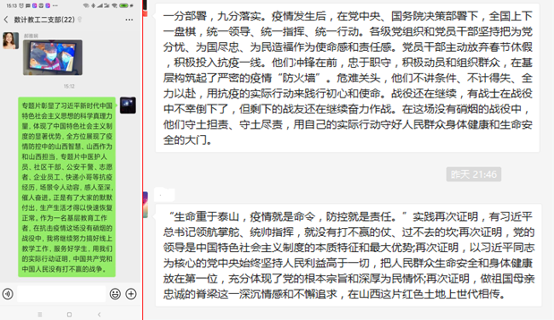 教师党员围绕“强化责任担当,弘扬‘战疫’精神”主题进行了线上讨论,纷纷表示要树牢“四个意识”,坚定“四个自信”,大力弘扬“战疫”精神,不忘立德树人使命,履职尽责,凝心聚力,为公司申博、团队建设、学科评估等重心工作服务,为公司改革发展和走好新时代山西高质量转型发展新征程贡献力量。