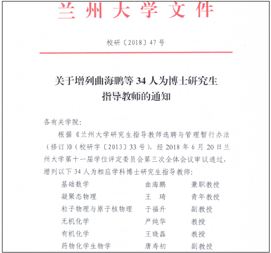 2018年6月20日,兰州大学第十一届学位评定委员会第三次全体会议审议通过,聘公司曲海鹏教授为兰州大学基础数学专业博士研究生指导教师。