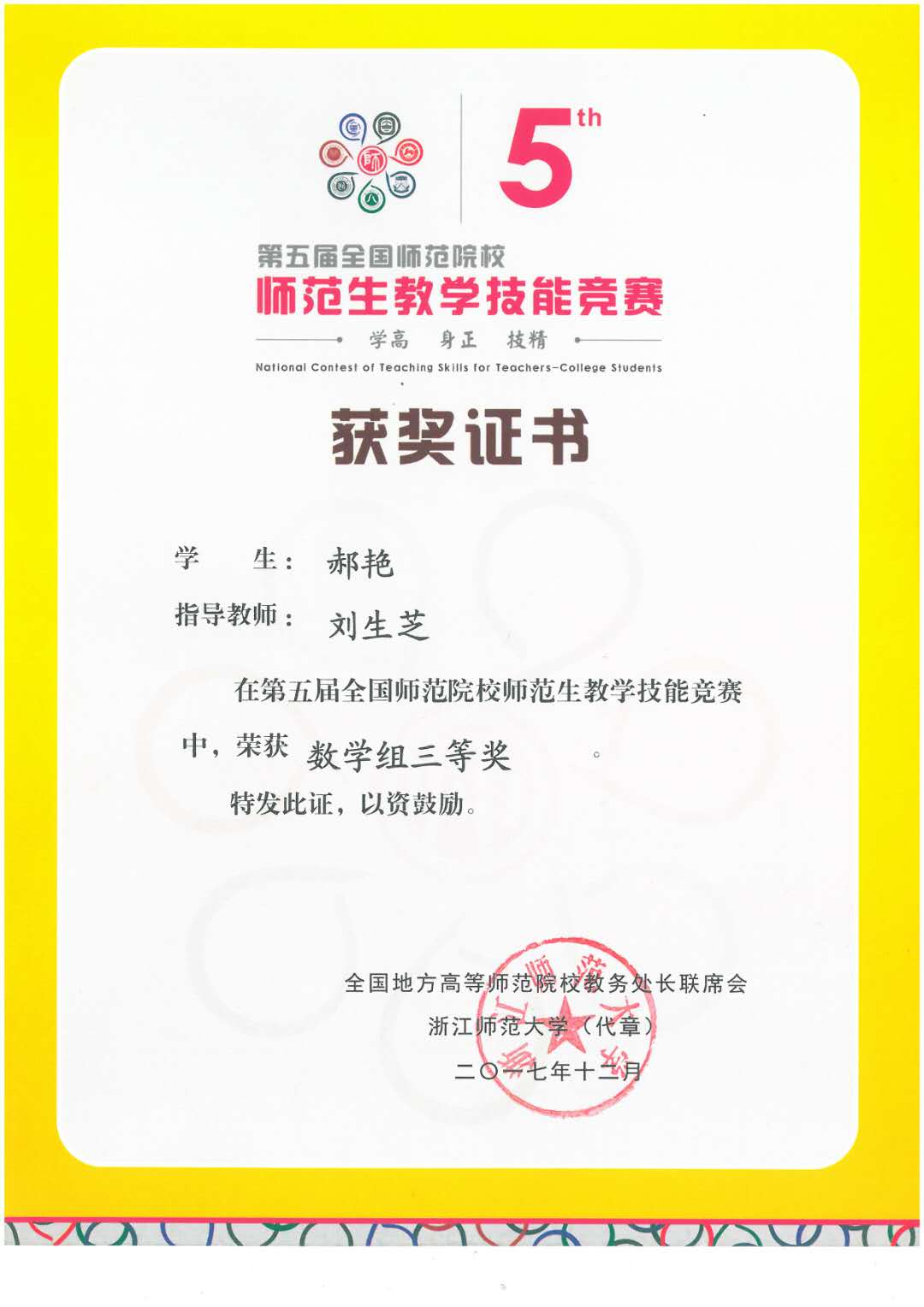 2017年12月7日至9日,第五届全国师范院校师范生教学技能竞赛在浙江师范大学举行,公司1401班郝艳同学在刘生芝老师指导下代表公司参赛喜获三等奖。