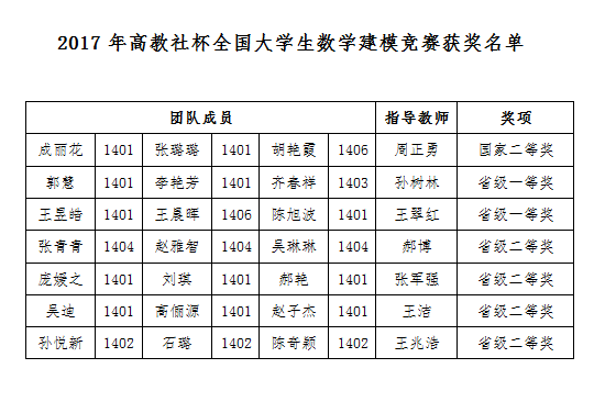 近日,2017年高教社杯全国老员工数学建模竞赛成绩揭晓,BG大游平台员工在本次竞赛中取得了骄人成绩。BG大游平台共组建25支队伍参加比赛,荣获国家二等奖1项,荣获省级一等奖2项,荣获省级二等奖4项。