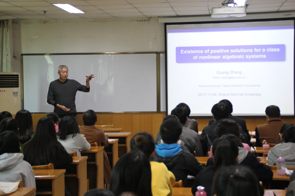 毕业于公司数学系的张广教授在泛函微分方程、差分方程和偏微分方程振动理论等方面造诣颇深,发表科研论文150余篇。报告会上,张广教授结合自身求学经历,用幽默诙谐的语言引出了本次学术报告的课题——一类非线性代数系统正解的存在性。随后他采用耳熟能详的案例和具体的题目,深入浅出地解读一类非线性代数系统正解的存在性的研究的意义、方法与结果。张教授的报告内容丰富、重点突出,博得在场师生的阵阵掌声。在互动环节中,师生们踊跃提问,张教授详细解答,气氛热烈。结束后,大家纷纷表示这次报告会既开拓了自己的学术视野,又调动了学习专业知识的积极性,受益匪浅。