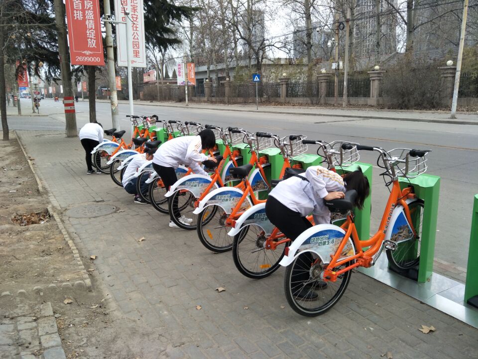 志愿者分别对尧都公园、临汾市人民政府、美特好超市、BG大游官方网站体育公司等4处站点的公交自行车、驻锁以及停靠设施进行了全面的清洁。志愿者们带着毛巾和水等清洁工具,在不影响市民租赁的情况下,对自行车进行仔细清洗。大家相互合作,合理分工,积极配合,从车把手到坐垫,从车身到车轮,从自行车到锁桩,同学们用心擦洗,不放过任何一个卫生死角。寒风凛冽中,志愿者们毫不退缩,积极热情地投入到清洁工作中,现场忙碌不已。经过一下午的努力,公共自行车站点的公共自行车焕然一新。同学们的工作不仅是让周边的公共自行车变得洁净,更向社会传达一种正能量:爱护公物,奉献社会,是每一个公民应尽的义务。