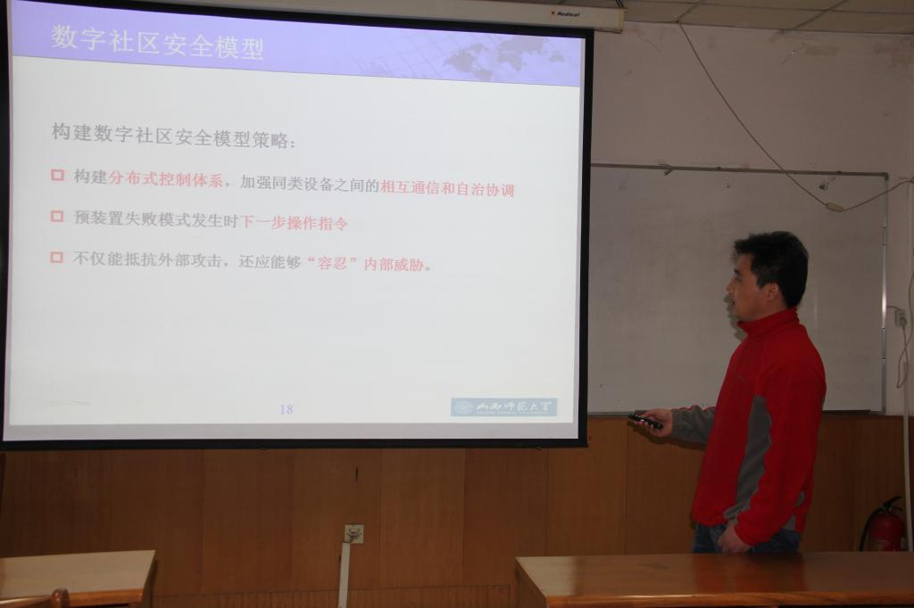 李洪涛老师作题为《数字社区安全体系结构及隐私保护策略研究》的报告